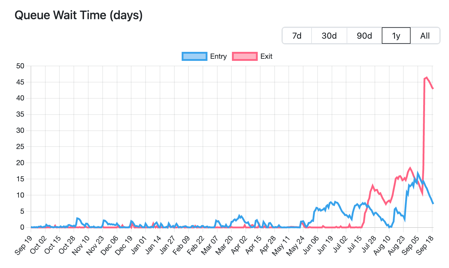 Roughly 2.6–2.7M ETH is in the unstaking queue, about six weeks of wait time, after provider Kiln began an “orderly” exit of all validators following the SwissBorg incident. Think of it like a busy bank lobby: the system’s fine; withdrawals just take longer and may add short-term price noise. It’s not a red flag, and, absent new shocks, the line should ease over the next few weeks as this one-off wave clears through Ethereum’s built-in churn limits.